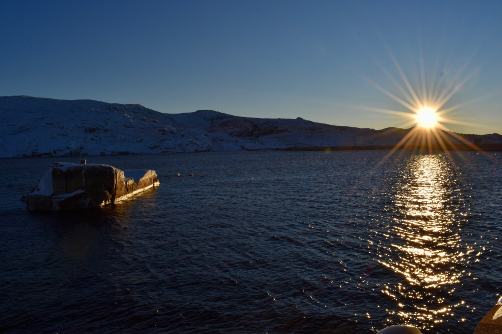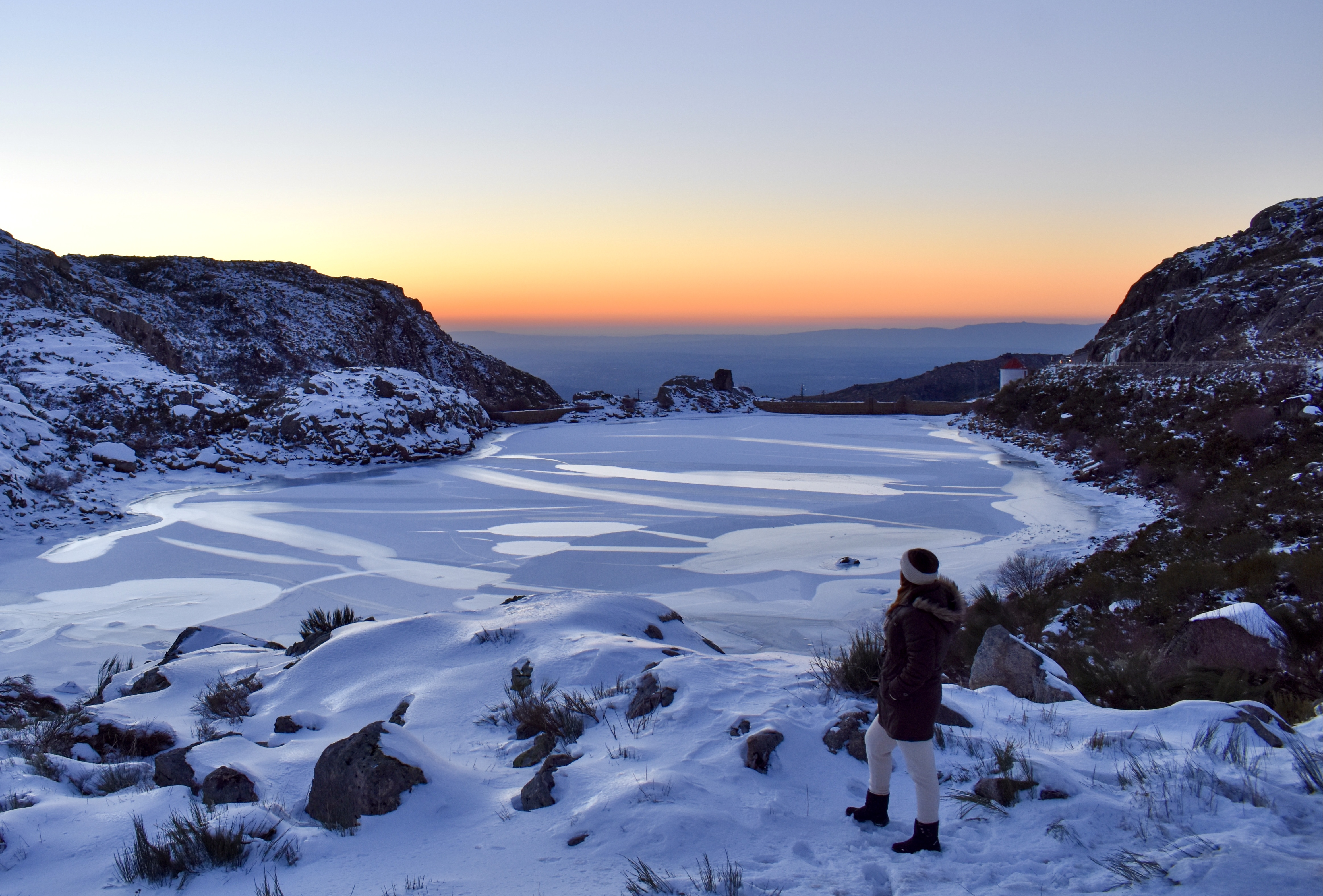 Continuando a descer, em 1 km encontrará à sua direita a Albufeira da Barragem do Covão do Curral. Já o sol se tinha escondido no horizonte e os seus tons quentes iluminavam a lagoa escondida pela neve. Não deu para esperar. Foi tempo de parar o carro e apreciar este momento em plena natureza. Um sítio tranquilo, bonito e sereno que será sempre uma boa recordação.